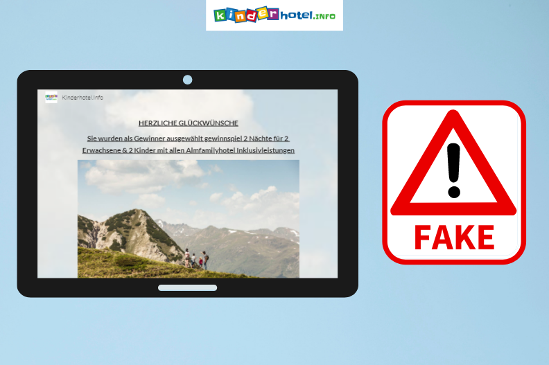 - Du hast die Freundschaftsanfrage bestätigt – nun dauert es nicht lange, bis du eine Privatnachricht in deinem Messenger-Postfach hast, die dir (in oftmals etwas holprigem Deutsch) die frohe Botschaft überbringt, dass du der große Gewinner des verlosten Familienurlaubs bist. Toll, oder? Leider nur bis zum Zeitpunkt, an dem du über einen merkwürdigen Link auf eine externe Seite weiterleitet wirst. Hier sollst du dich registrieren, um deinen Gewinn zu erhalten – und zwar mit sämtlichen sensiblen Daten und unter Angabe deiner Bank- oder Kreditkartendaten. Spätestens jetzt ist klar, dass hier etwas nicht stimmt… Tipp: Nicht auf Links in angeblichen Gewinnbenachrichtigungen klicken! Kinderhotel.info arbeitet niemals mit externen Gewinnspielseiten, SMS-Codes und verlangt unter keinen Umständen die Bank- oder Kreditkartendaten von Gewinnerfamilien. Warum sollten wir auch? Immerhin sind die verlosten Familienurlaube zu 100 % kostenlos!