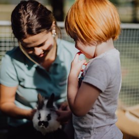 • Spielplatz mit Baumhaus und Kleintiere zum Liebhaben und Pflegen wie Hasen, Hühner, Katzen, Ponys, Pferde