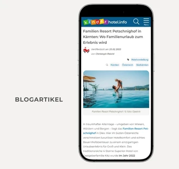 Der Inhalt wird von uns erstellt und mit Ihnen abgestimmt. Themen können eine allgemeine Vorstellung des Hotels, spezielle Urlaubsangebote oder Neuigkeiten sein. Zudem werden Bilder sowie Verlinkungen zu Ihrer Website eingebunden.